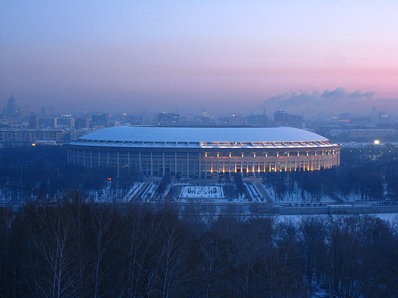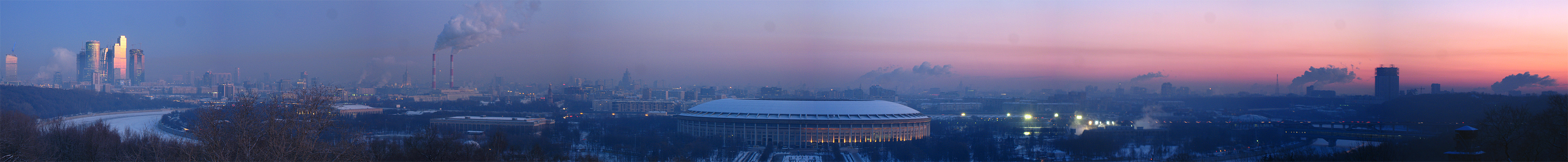 Moscow State University just behind the edge of the hill.Turning around, the sun comes up from the right and hits the top of these buildings first.The Moscow fútbol stadium in the center of our view.Looking eastward at the rising sun.The panorama (open in new tab to enlarge)Turns out it was colder this morning than on Tuesday evening. It did feel a bit chilly out on the hill.