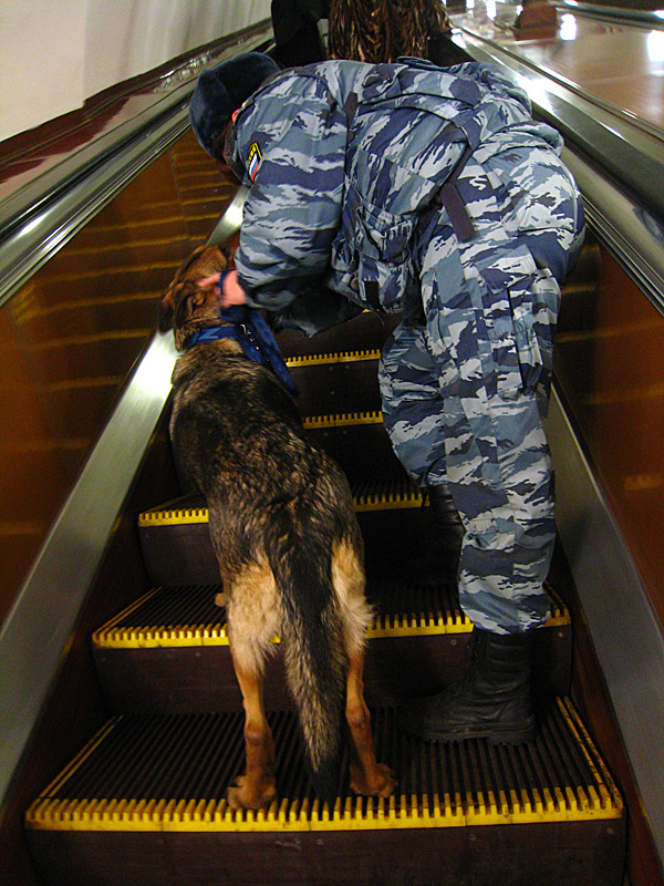 Back on the metro I was able to witness a very cool event. A police officer brought her dog on board and told it to lay down next to her. This dog was extremely well trained and did as told. It remained calm the entire ride and luckily I got off at the same station as them. Then I watched her and the dog mount the escalator. I stole a photo during this moment: