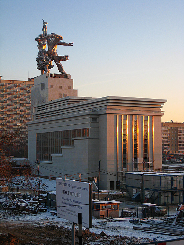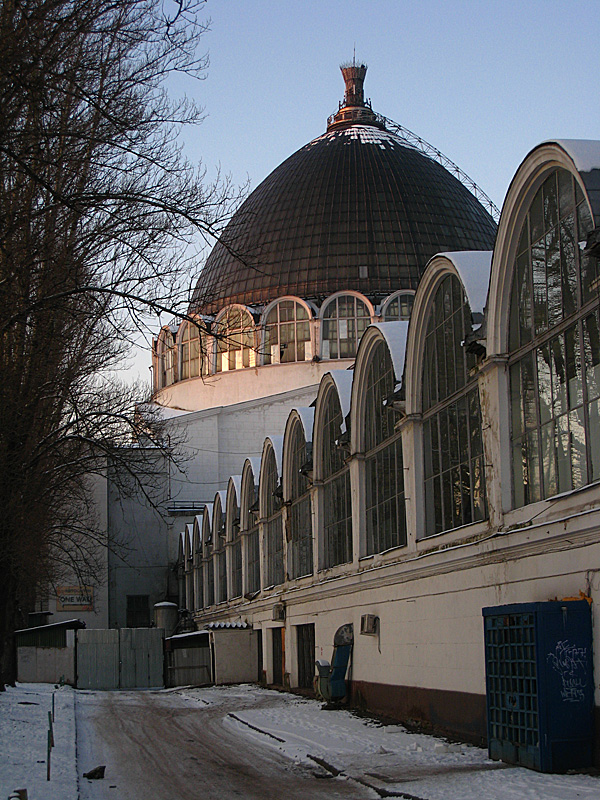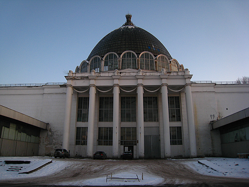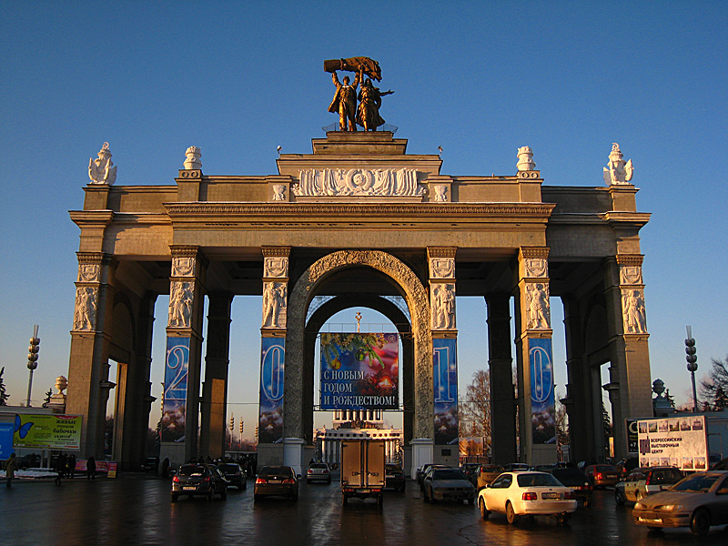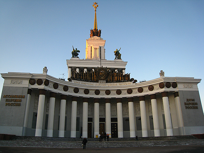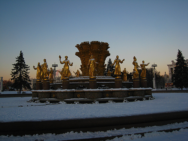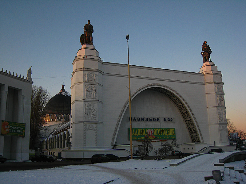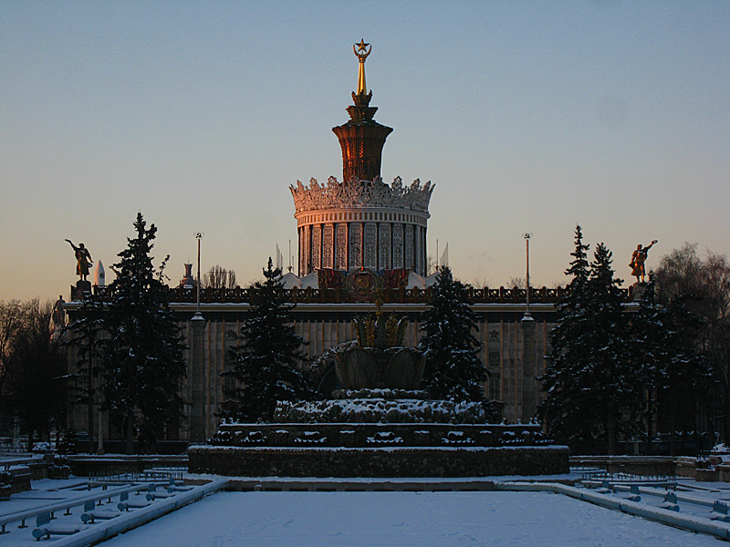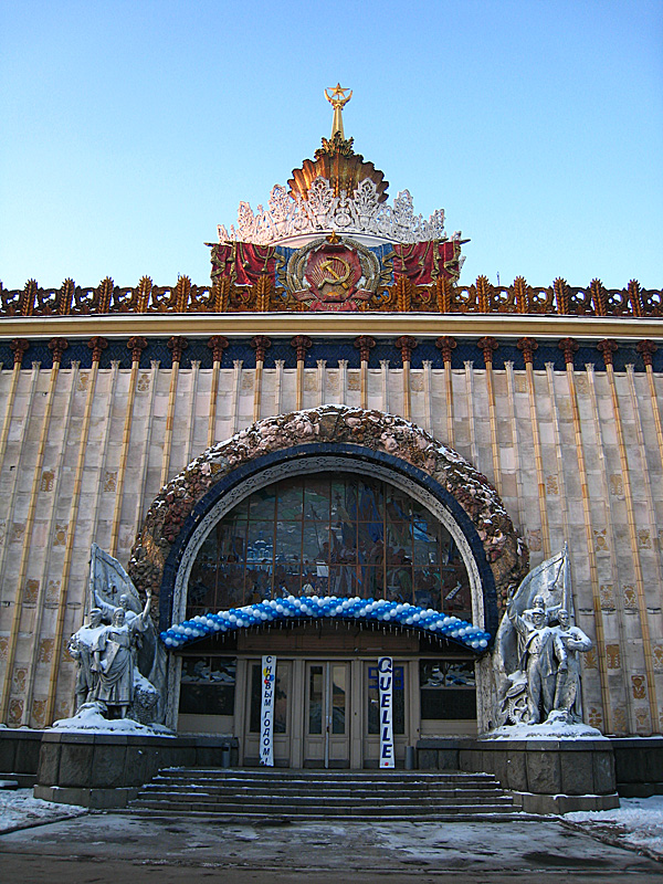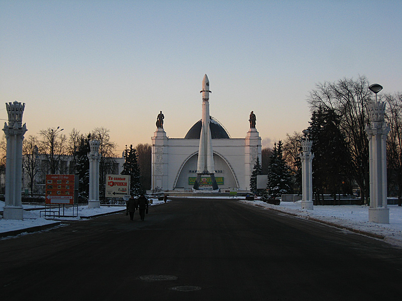 Close up of the Stalin Skyscraper.Inside the building there were tourist markets. Cell phones, cameras, and other technology were on racks for sale. But the exquisite decorations still peaked through above and behind all this.A gold fountain on the other side of the Stalin building.A Christmas Tree! On the left, the dome I wanted to see. Another Stalinesque building on the right, and one of a different style in the middle.The long pool, now frozen, in front of the middle building.The Soviet Logo still looking good at the top of the building.I was getting closer to the dome. Now there was a rocket in front of it.And a plane. with CCCP on it. You don’t see many of these nowadays.Close-up of the rocket“Pavilion No.32” it read on the front of the huge building with the dome. I didn’t know what to think of it from this close. I was expecting a giant cathedral with detailed decorations and now it turns out it’s a Soviet Building.I decided to walk around it, clockwise. The building was still pretty amazing but in a different way. I was unsure what to make of the architecture and glass. It seemed like it had the potential to be beautiful, but the cheap glass created a setback.From the backside of it. It took me almost an hour to get to this point along the walk and I didn’t dillydally, except for the quick photo every 5 seconds.