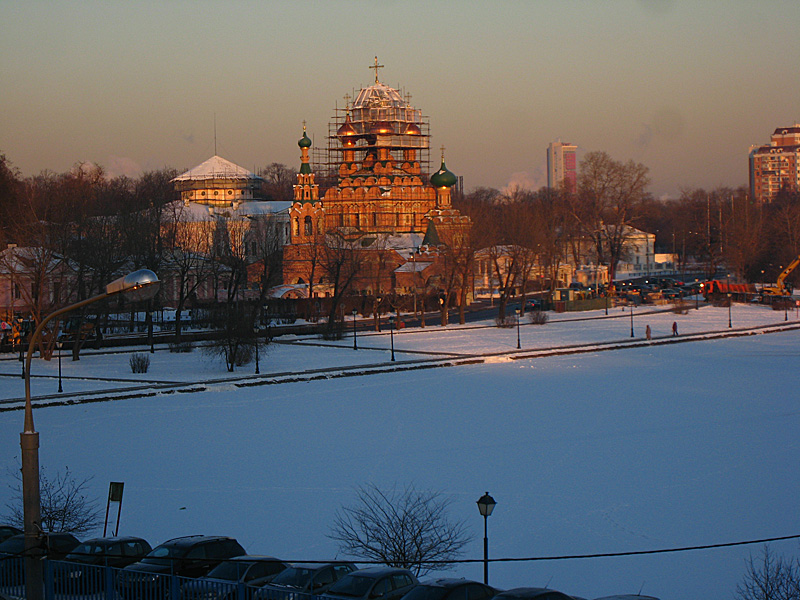 Russia has a monorail. But it was just as cold as the outdoors and so not very comfortable like the metro.Unfortunately, Ostakino Tower was closed to the public. I mean really closed, not the “oh, it’s closed but we’re Russians so we can still get in” kind of closed. That barb wire looked pretty serious.The tower looked pretty ominous. I wanted to go up to the observation deck and look out over the city but it was still being renovated after the 2007 fire. Maybe next time.Behind me another church stood, also under renovation.