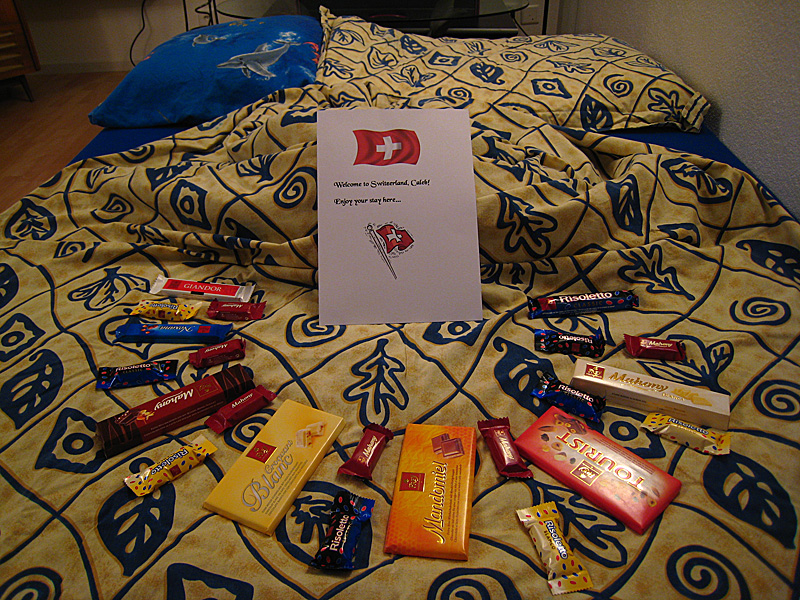 “Welcome to Switzerland” – Look at all that chocolate! How thoughtful. I have been trying to eat a piece a day. Luckily, this is not difficult as Swiss chocolate is nothing less than the best.