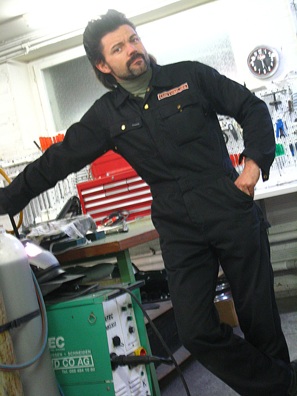 Roger, the man behind the craft. Each motorcycle is unique. He never builds the same motorcycle twice. The orange one is his, the yellow one is a work in progress for his girlfriend. He takes after Hugh Jackman as Wolverine. There were a couple posters hanging up. I think he’s doing pretty good. And he even rocks the pompadour when he dresses in formal wear.