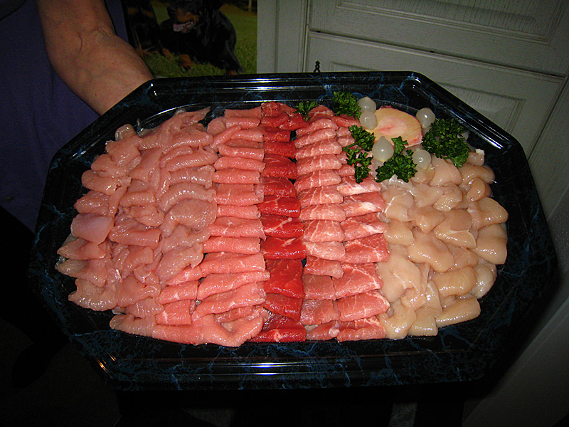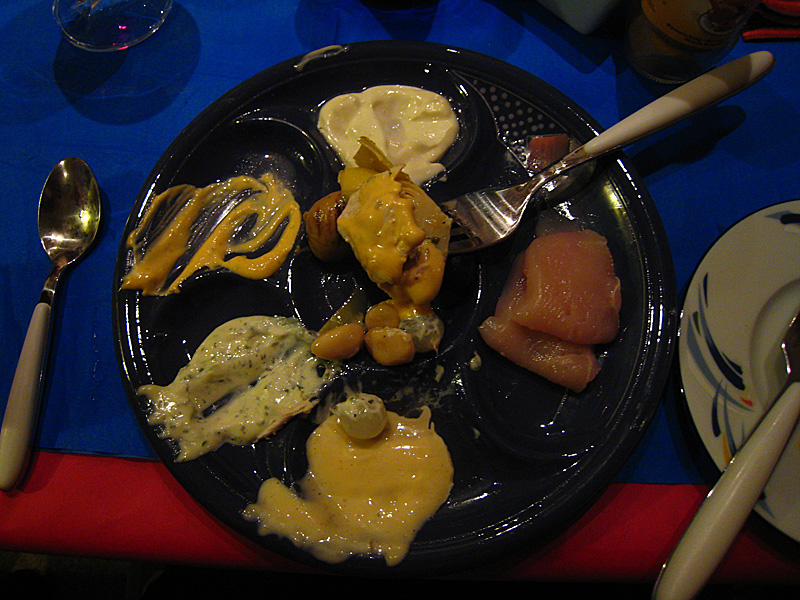 My plate somewhat toward the beginning of the meal. Everything was delicious. At first I was frustrated by how it took a long time to cook each piece of meat, and then I had to wait again to cook another piece. But later I liked it as it made me eat slower and I could eat less. That didn’t stop me from over filling myself and then consuming almost a pound of chocolate afterward.